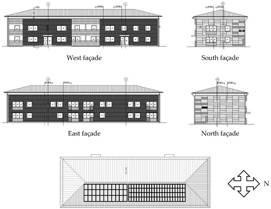 The case building is a two-story, multifamily building that was built during the million homes program (1965–1974) in Sweden [20] and its design is typical of the time. Building design, orientation and installed photovoltaics are shown in Figure 2. The geographical location of the building is in the city of Umeå, Sweden, located in a cold climate 455 km south of the Arctic Circle.