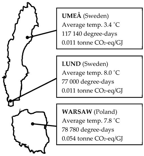 Three geographical sites in Europe, Umeå and Lund in Sweden and Warsaw in Poland were used in order to study the influence of climate and heat source on ROIEnergy/GHGe and AYEnergy/GHGe. The degree-days has been calculated for an indoor heating requirement of 17 °C. The remaining heat requirement is assumed to be covered by internal loads.
