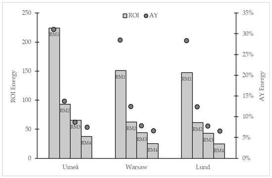 Comparison of refurbishment investments affecting operational heating. The measures have been assessed from an energy perspective using ROIEnergy and AYEnergy as EPMs for three geographical locations. ROIEnergy is read on the left axis (shown as columns) and AYEnergy on the right axis (shown as circles).