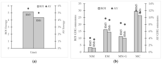Assessment of investments in photovoltaics in Umeå, Sweden that affect purchased operational electricity. ROI is read on the left axis (shown as columns) and AY is read on the right axis (shown as circles). (a) Return on invested energy and annual energy yield; (b) assessed from a GHG emissions perspective using ROIGHGe and AYGHGe as EPMs. To assess GHG emissions four different environmental impact principles for electricity have been used: Nordic electricity mix (NM), European electricity mix (EM), marginal electricity based on natural gas (MN-G) and marginal electricity based on coal (MC).