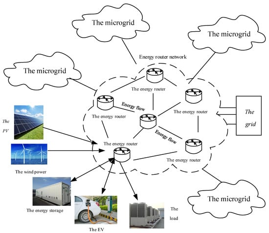 At present, energy router research is still in a primary stage. In [19], a distributed power routing control strategy based on the Dijkstra algorithm method for the management and coordination control of power flow in energy routers was put forward. A three-layer tree architecture of an intelligent distributed energy network based on the multi-energy router concept is drawn in [20], where the typical characteristics of the energy router are summarized and analyzed. In [21], the authors presented the main circuit structure of a multi-interface energy router based on a power electronic converter and introduce the control strategy of each module of an energy router. A distributed energy router is designed in [22] and its control mode is designed to ensure the stability of AC and DC buses. However, different DGs have different characteristics and requirements. The common DGs are wind power, PV, energy storage and EVs [23,24]. The PV power generation has the characteristics of randomness, volatility and weak reactive power support [25]. Theories show that distributed energy storage is an effective approach to solve the problems of PV mentioned above [26,27]. EVs are controllable in time and mobile in space. They could be used as micro sources (V2G) to release electric energy. They could also be used as a load (charging), which is inserted into the grid to store electricity [28,29,30]. In fact, energy routers need to ensure the normal operation and quality of the power grid, but it is also important to ensure the reasonable flow of distributed energy, meet the load demand and control the correct and safe energy flow intelligently.