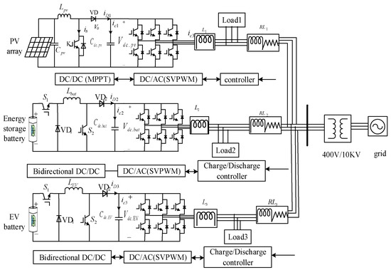 In order to study the energy routing strategy for the integrated microgrid, including PV, battery-energy storage and EVs, their structures are designed in this paper as shown in Figure 3, which includes a PV system, battery-energy storage system, EV system, load and the inverter control systems of each system.