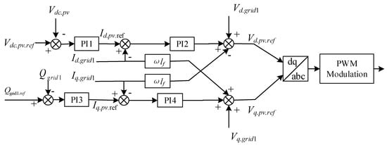 In Figure 6, the PV power generation inverter adopts double loop control, the outer ring is constant DC voltage and constant reactive power control, the inner ring is current control. Vq.grid.ref and Vd.grid.ref are respectively the instruction values of the d and q axis components of the grid side voltage. Vdc.pv is the output voltage actual value of the unidirectional DC/DC converter of PV, Qgrid1 is the reactive power actual value of the grid. They are the input of outer ring value of the inverter control system, and are compared respectively with the DC voltage instruction value of PV Vdc.pv.ref and network side reactive power instruction value Qgrid1.ref.
