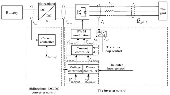 Figure 8 is the schematic diagram of the battery-energy storage control system. It consists of a bidirectional DC/DC converter control and inverter control. The principle of the bidirectional DC/DC control has been explained previously, the inverter is controlled by dual closed-loop control of voltage and current.