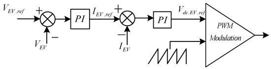 The control principle of the AC/DC inverter is same as that of discharge. Two different control modules of constant current and constant pressure are established on the DC/DC control side respectively. The switching of constant current and constant voltage charging mode is realized according to the battery terminal voltage. The current loop PI control is adopted in the constant current stage. By changing the duty cycle ratio, the on-off of the switch tube is controlled and the output current is kept constant. The control structure of the inverter is shown in Figure 9.