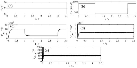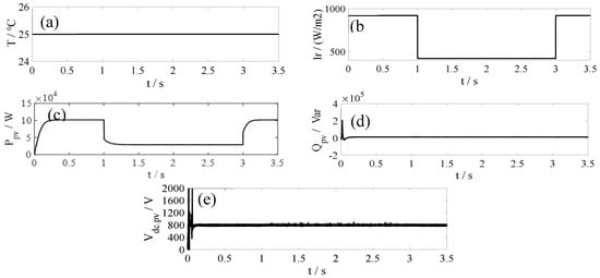 As depicted in Figure 14b, the light intensity of the PV array decreased at around 1 s and increased back to the original state at around 3 s. In Figure 14c, the active power output of the PV array has the same change trend, and falls at around 1 s and increases back to the original state at around 3 s, therefore the PV array has realized the MPPT operation under the control of DC/DC. The variation of active power output is smooth and reduces the impact on the system. The reactive power of the AC side of the PV inverter is stable at 10,000 Var, as shown in Figure 14d. Figure 14e shows that the DC voltage of the inverter can be stabilized at around 800 V, which is the same as the reactive power and DC voltage instruction value of the grid side. As a power source of the power grid, PV has characteristics of uncertainty and randomness. The constant reactive power constant DC voltage control strategy of DC/AC inverter used in this paper can achieve the function of releasing reactive power according to the instruction of power grid, stabilizing DC voltage, and then stabilizing the active power.