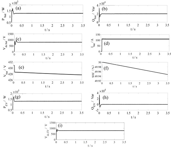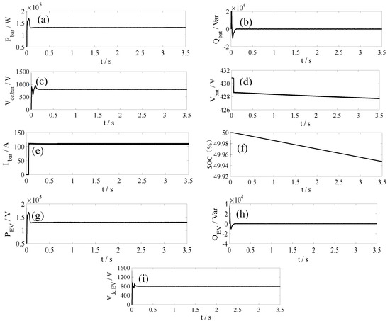 Figure 12a–f are the battery-energy storage results. The reactive power of the battery-energy storage could well track its instruction value shows Figure 12b, which is about 0 Var. As shown in Figure 12c, the DC voltage at the inverter side could track well its instruction value that is 800 V. The active power of it could stabilize the output as shown in Figure 12a. As depicted in Figure 12d–f, the bidirectional DC/DC converter of battery-energy storage adopts the constant current discharge control method, and the discharge current is basically kept at around 112 A as shown in Figure 12d. The discharge voltage is slightly reduced is shown in Figure 12e and the charge capacity of the battery decreases uniformly is shown in Figure 12f. The battery-energy storage could be controlled by constant DC voltage constant reactive power and the mode of constant current, which can realize stable output of the reactive power and active power, thus ensure the stable operation of the power grid. Figure 12g–i are the simulation results of EV. It can be seen that under the control of constant reactive power and constant DC voltage of energy router, EV could also be connected to the network stably.