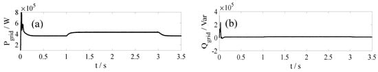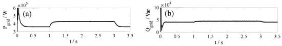 Figure 16 shows the active and reactive power generated by the grid. The active and reactive load of this system are respectively 0.06 MW and 0.06 MVar. The active power generated by the grid makes up for the demand of active power load as shown in Figure 16a. Since the reactive power instruction values of the DG are respectively 10,000 Var, 20,000 Var, 0 Var., the rest of the reactive power of the system is provided by the grid. As shown in Figure 16b, the reactive power of grid is about 30,000 Var.