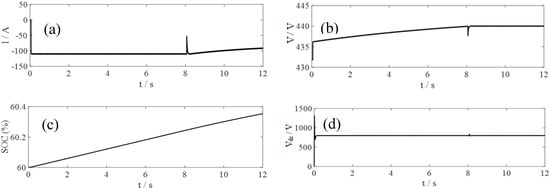 Figure 17 shows the simulation results of the EV when it is the load of the grid. The constant current and constant voltage are adopted when the EV is charged. The constant current charging current is 10 A, and the constant voltage charging voltage is 440 V. It can be seen from Figure 17a,b, that a constant current is adopted at the beginning stage, and this constant current is 110 A. With the deepening of charging, the battery voltage gradually increases to 440 V, and the charging machine is switched to the constant voltage charging mode. The constant current charging time is 8 s. After 8 s, the terminal voltage of the power battery remains at 440 V, the charging current gradually decreases and enters the trickling charging stage. The battery continues to be charged. It can be seen from Figure 17c,d that the charge capacity of the power battery increases faster in the constant current stage, while the charge capacity increases slowly in the constant voltage stage due to the reduction of charging current. The intermediate voltage of AC/DC inverter remains stable after charging, which verifies the effectiveness of the control strategy of constant voltage and constant current charging of the power battery.