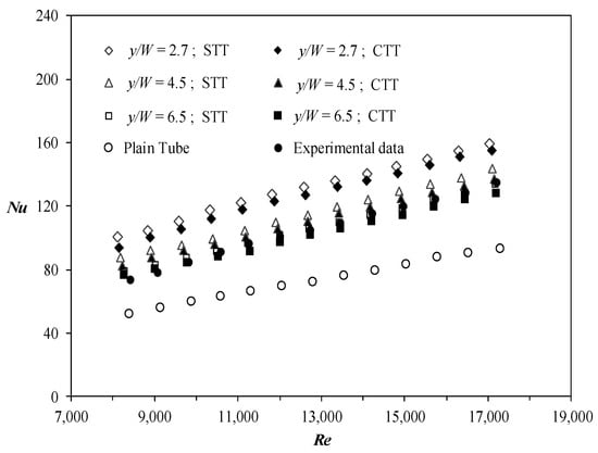 - Nu, f, and η of both the CTTs and STTs with various pitch ratios of the enhanced tube are higher compared to those of the plain tube. the decrease of the pitch ratio leads to the increase of Nu, f, and η.