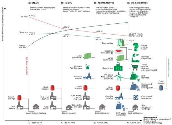 While it is a centuries-old technology, district heating is only now emerging as a critical player in the challenges of reducing carbon emissions and improving the efficiency of energy use [5]. District heating has been recorded as far back as the 14th century in France, but not recorded until much later in the United States, around the late 19th century. District Heating Network (DHN) classification is commonly based on heat transfer fluid, energy source, energy supply, or time period of installation [6,7]; however, the definitions laid out within these categories are often inconsistent across published examples. To gain any appreciation, the individual scheme should always be considered and not a vague description of “generation”. Figure 1 summarizes district heating and energy development. It shows how DHNs have evolved from a very high enthalpy, low technology (1st Generation district heating) into a much lower enthalpy and technologically diverse heat and energy supply (3rd and 4th Generation district heating).