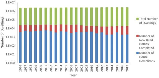 One of the largest efficiency losses from district heating is from secondary factors associated with end users. This is a difficult issue to address because it is caused by low quality buildings, high network supply temperatures and poor end user management. The current building stock is built to comply with current legislation (Buildings (Scotland) Act 2003 and Climate Change (Scotland) Act 2009), which does not plan for a sustainable future or any future district energy integration [13,14]. Figure 2 shows the number of demolished properties in Scotland compared with the number of completed new build homes and the total number of homes [15,16,17]. This shows that, while a significant number of new properties are entering the market, very few are being removed. This means that older properties will have a significant impact on future energy efficiency and must be considered now, not in the distant future when political concern is more likely to be directed at the heating sector.