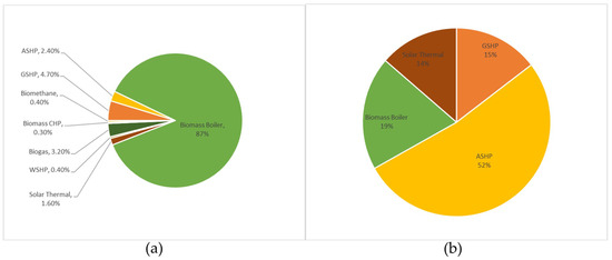 Comparison of Renewable Heat Incentive installations by technology type as of October 2018. (a) Non-Domestic RHI and (b) Domestic RHI [87,88].