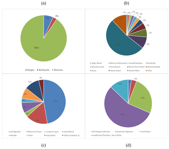 UK biofuel usage split for 2016 and 2017. (a) Total split of biofuel usage, (b) split of biomass fuel usage, (c) split of bioliquids fuel usage and (d) split of biogas fuel usage [93].