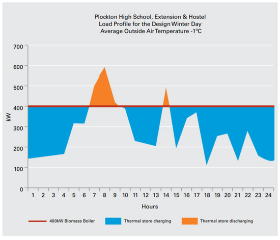 There are very few documented examples of TES in the United Kingdom. One example is Plockton High school. This is a high school on the North West coast of Scotland (57.334340, −5.666381), with boarding for students. It uses a 400 kW baseload biomass boiler, supplemental oil boiler and three 10 m3 TES tanks. The capital cost of this project was £624,000 and is expected to save £64,000 per year on energy costs. The distribution network operates at 90 °C, typical for a 3G DHN. This is a fairly small scheme, with a peak load of 590 kW, designed for fuel security in an area of the United Kingdom not connected to the gas grid. The school is able to store around 3 weeks of biomass, providing fuel security the previous oil burner system could not. The thermal profile is given in Figure 6. This shows the biomass boiler running constantly at full capacity, loading the thermal store at low demand periods and discharging when needed [108].