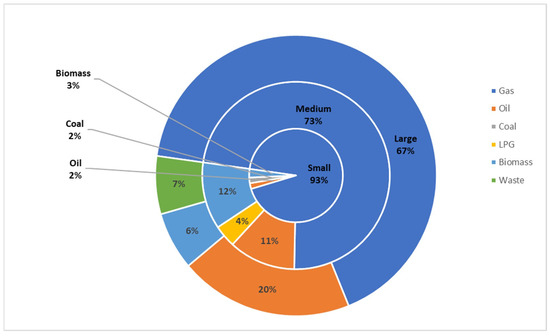 It has already been described that DHNs have a low penetration in the U.K. heating market, with the Department of Energy and Climate Change (DECC, which was later replaced by the Department of Business, Energy and Industrial Strategy) estimating there are around 2000 schemes in the United Kingdom, with 55% of these in London [133]. Figure 7 shows the fuel type by size of DHN for available data (710 schemes), excluding any unknown fuel sources (1095 schemes). The DECC report defines users as [134]:
