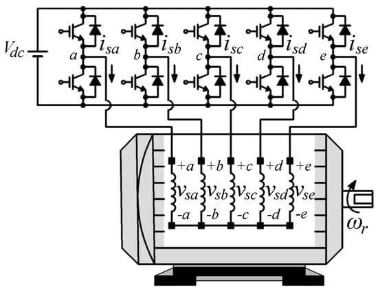 The case under study is a symmetrical five-phase induction machine, where the stator windings are equally displaced (ϑ = 2π/5) and sinusoidally distributed along the stator. The multiphase drive is power-supplied using a two-level VSI, as can be observed in Figure 1.