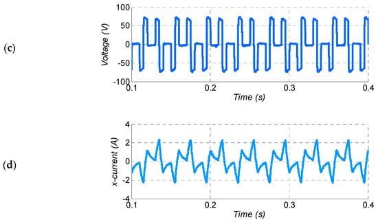 Applied stator voltage in the winding connection 1 (a) and the measured isα (b). Applied stator voltage in the winding connection 2 (c) and the measured isx (d).