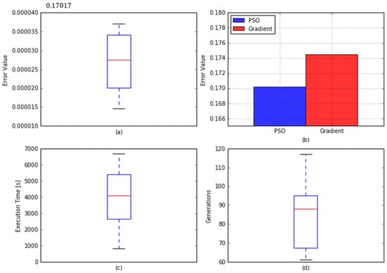 Statistical analysis of the results showing (a) the obtained estimation error, (b) a performance comparison between the PSO-based and gradient-based approaches, (c) the execution time of the proposed estimation procedure, and (d) the number of generation required for the convergence of the algorithm.