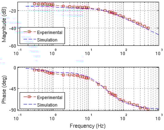 Simulation (blue dashed plot) and experimental (red squares plot) Bode frequency responses in the α-β subspace.