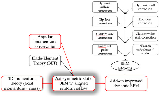 Constituents of the BEM model. The shaded box indicates the part of the BEM model which is modelled and corrected in this work. The four red boxes indicate the chain of dependency for the momentum conservation corrections.