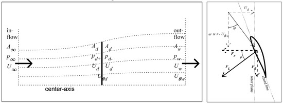 We assume a rotor disk perpendicular to a passing flow, see Figure 2 (left). The common assumptions apply to the undisturbed flow: steady, uniform, inviscid and incompressible.