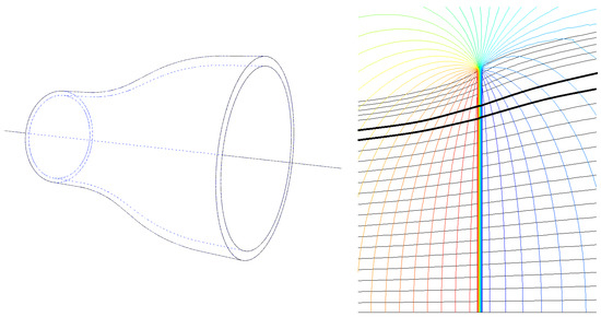 (Left): An annular element bounded by four surfaces: Inlet, outlet, outer surface , inner surface . (Right): Cross-section axi-symmetric CFD domain part surrounding the disk. Black streamlines show the annular element radial expansion (one is highlighted black), colored lines are isobar contours. Note that due to the wake (streamline) expansion and the pressure gradients in the disk’s vicinity, the pressure integrals in Equation (16) will be non-zero.