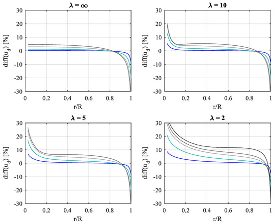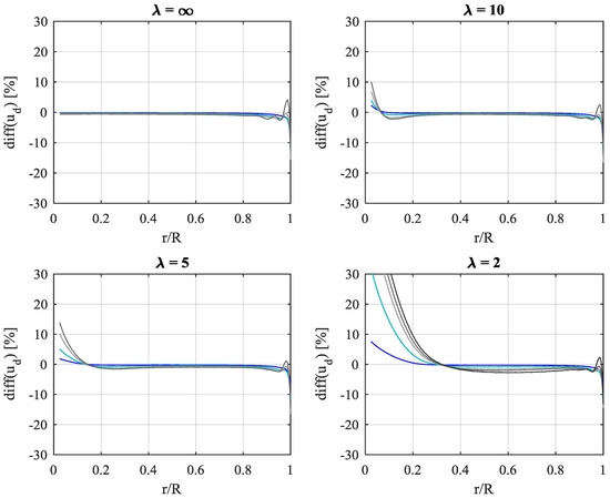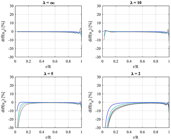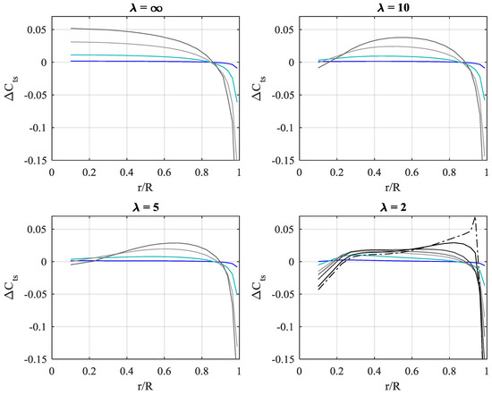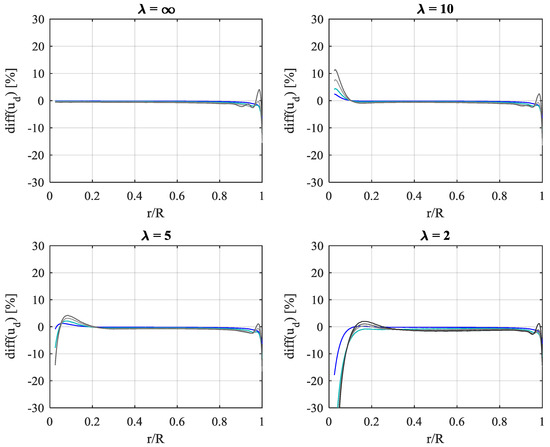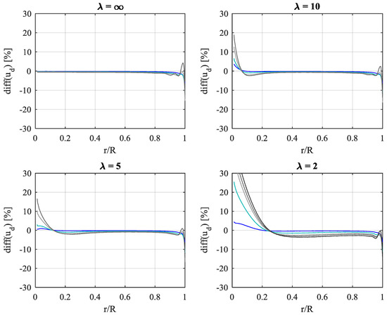 The AD code is developed using Comsol MultiPhysics® [27]. In accordance with the inviscid flow assumption used for the BEM, the equations solved are the inviscid, incompressible Navier-Stokes equations in axisymmetric coordinates, without any turbulence model. A weak form Galerkin finite element formulation is used for discretization. All AD computations were solved using linear finite element basis functions (P1P1) and fixed mesh spacing parameters for the entire set of AD steady simulations. Discretization independency was initially checked for a highly loaded disk by comparing thrust and power coefficients obtained with basis functions of increasing order: first order (P1P1), mixed quadratic/first order (P2P1), and mixed cubic/quadratic order (P3P2). Results are presented in Table A1 and Figure A1. The notion of “P3P2(*)” refers to the repeated use of P3P2 basis functions but on a refined mesh with 3 times smaller mesh sizes (9 times area-wise) in a vicinity of the disk within 2 tip-radii, R, and a mesh element count of approx. 1 million elements. Segregated Newton solvers are used for the flow velocities and pressure. The projection method [28] used for the incompressible NS employs consistent streamline and crosswind diffusion for numerical stability and pseudo-time-stepping for advancing the temporal marching towards a steady solution. The P1P1 was favored because of higher execution speed. The lack of higher-order precision was compensated for by employing high mesh resolution. Table A1 shows the change in rotor power efficiency when higher order discretization schemes are used on the same mesh (configurations 2–3) and when combining higher order discretization with increased mesh resolution (configurations 4). decreases marginally with up to 0.1% when increasing discretization order and mesh resolution. Satisfactory discretization independency is shown within 3 significant digits. The tendency of slightly decreasing is due to improved capture of the slip discontinuity between wake and surrounding flow with improved discretization accuracy and resolution. The inevitable introduction of even the slightest numerical diffusion along the slip-line will cause a slight transfer of energy from the high-momentum surrounding flow to the low-momentum wake, thereby artificially increasing the potential for power extraction, although marginally. This is also evident from Figure A1, where the radial distribution of the discretization-induced change in reaches a maximum towards the disk tip, indicating that the tip area is particularly sensitive to discretization and numerical diffusion.