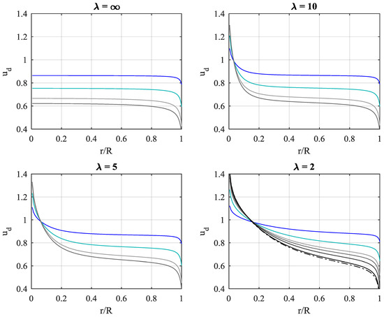The trend towards the disk perimeter is the reverse: negative values. The zero-crossing location is around 90% relative radius, and the negative peak at the tip is around −20% of . This rather sharp drop of can be regarded as a disk perimeter downwash effect characterized by a large radial flow component. However, it should not be regarded as a tip-loss effect. Tip-loss in the Prandtl sense is the physical consequence of a rotor having a finite number of blade tips shedding discrete tip vortices. Therefore, an axi-symmetric disk has zero tip-loss. The AD simulations are set up to equal the BEM flow, i.e., no turbulence model, and no viscosity. Therefore, the absence of eddy diffusivity (turbulence model) will cause the AD simulations to diverge upon entering a reversed-flow wake state at high disk loading conditions. The specific AD simulation for with the highest loading is locally at the tip very close to wake flow reversal. This probably explains the different shape of the radial distribution for this computation.