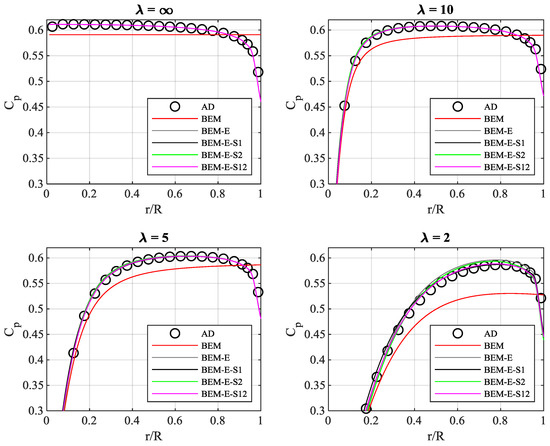 Glauert commented in [7] that the simplified axial momentum conservation “may imply the neglect of the mutual interference between the various annular elements”, but also that the modeling error was “believed to be extremely small in general”. Goorjian proved in [15] that the simplified axial momentum conservation, i.e., Equation (1) with zero and zero , is incorrect when pressure gradients induced by the rotor disk are taken into consideration. The inclusion of , named in their work, was later devised for infinite tip-speed-ratio and constant spanwise loading by Sørensen and Mikkelsen [16] and for a range of tip-speed-ratios, Sørensen [17]. Inclusion of the missing momentum conservation terms has also been analyzed and discussed by van Kuik et al. [18], Branlard [19], and van Kuik [20]. Xiros [21] reasoned that the mutual momentum impact between adjacent annuli would cause increased potential for power extraction for a highly loaded rotor and even exceed Betz limit. Madsen [14] quantified the assumed influence of annular element axial momentum interexchange by fitting the classical BEM to actuator disk results. It was shown that the obtainable local power efficiency indeed can exceed Betz limit on the inner part of the rotor, but that the local power efficiency drops towards the rotor tip, such that the overall obtainable power efficiency seems to be unaffected.