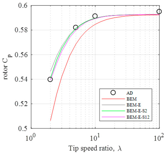 Benchmarking of the axi-symmetric static BEM model against full 3D CFD, experimental scale-tests, or full-scale wind turbine measurements is not fully appropriate in this case, since the non-containment of all the BEM add-ons (see Figure 1) in the axi-symmetric static BEM model would cause comparison discrepancies from the lack of tip-loss, root-loss, etc. to contaminate the sought-after discrepancy. While the add-on improved dynamic BEM model should be compared against experimental/physical test results, the analytically formulated axi-symmetric static BEM is void of the more empirically founded add-ons, and therefore better suited for comparison against an equivalent numerical model like the AD CFD, see e.g., [13,14,16,17].