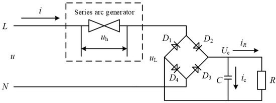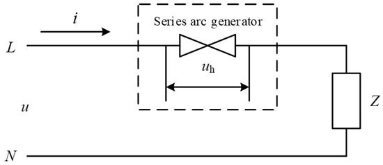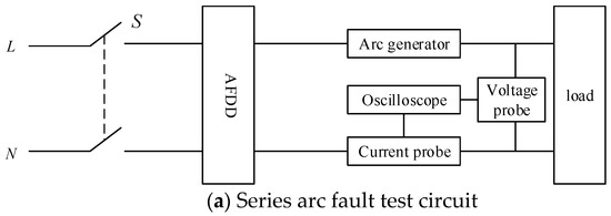 An arc is a continuous luminous discharge of electricity across an insulating medium, usually accompanied by a partial volatilization of the electrodes, and is a very complicated electromagnetic reaction process [1]. An arc fault is the phenomenon of a gas-free discharge caused by an air breakdown owing to the aging of the insulation in electrical lines or equipment, loosening of electrical connections, air humidity, and/or a sharp rise in voltage or current [2]. An arc occurs continuously during a certain period of time, and the internal temperature of the arc fault can reach 5000–15,000 °C [3], which is an important factor that may cause an electrical fire. When a series arc fault occurs in a line, a traditional circuit breaker cannot provide protection because the line current is less than the normal working current [4]. Therefore, a reliable series arc detection method and protection technology is important for reducing electrical fires. Major countries worldwide have promulgated standards for arc fault detection and protection. For example, in 1998, the United States promulgated the relevant design standard, UL 1699, for arc fault circuit interrupters. The International Electrotechnical Commission (IEC) promulgated the International Standard, IEC 62606: 2013, namely, “General Requirements for Arc Fault Detection Appliances (AFDD),” in 2013. China also promulgated two national standards related to arc fault detection and protection in 2014 [2,5]. At the same time, research into series arc fault detection technologies has become a research hotspot in the field of electrical safety.