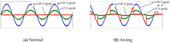 Figure 7a shows the waveforms of the current and voltage when no series arc faults occur and when the load is from a diode rectifier with a capacitor filter circuit, whereas Figure 7b shows the waveforms when series arc faults occur. Pulses are present in the two current waveforms and have similar shoulders. As the reason for the results in Figure 7a, when u is less than Uc, the diodes are not conducting. The current waveform shown in Figure 7b has random characteristics owing to the dynamic change in the arc resistance when an arc fault occurs. By detecting randomness, one can detect whether an arc fault has occurred.