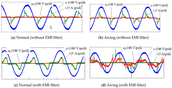 The explanation of the results in Figure 7d is as follows. Assume that the voltage on capacitance Cx is uL. When |u − uL| < Uz, the arc gap cannot be broken, the arc gap resistance Rh is extremely large, and current i is zero; however, when |u − uL| > Uz, the arc gap is broken, a series arc occurs, and Rh rapidly decreases. Because uL is less than Uc, the diodes remain in a reverse blocking state. Moreover, the inductance in the EMI filter will block the passage of the current. Most of current i will charge Cx. In addition, i will increase rapidly from zero to Uz/Rh. Because the capacity of capacitance Cx is too small, uL increases much faster than u, causing uh to decrease rapidly and become smaller than Us; the arc will then be extinguished, and i will rapidly decrease to zero, which is why the pulses appear in the current waveform. Owing to the influence of the filter inductor, the voltage uL on Cx does not change much during the following period. With the increase in u, when u > (uL + Uz), the arc gap will be broken again. A pulse again appears in i. Other pulses also appear for the same reason. Moreover, uL will continue to increase, and when its value approaches Uc, if u continues to increase and meets the condition |u| > Uc + Uz, the arc will occur again. During this period, the diodes are randomly turned on or off, the reason for which is as follows: because the distance of the arc gap is uncertain, the arc-extinguishing voltage Us is uncertain even at the same current. When the arc gap is broken, if uh is always larger than Us during the increase in uL, the arc will be not extinguished, and the diodes will turn on. If uh < Us at some point during the period of increase in uL, the arc will be extinguished, and the diode will not turn on.