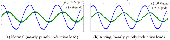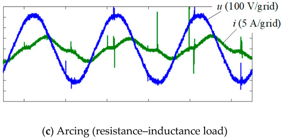 Based on the above characteristics, it is easier to judge whether series arc faults occur under this load. When arc faults occur, the volt–ampere characteristics are mainly affected by the capacitance Cx. Thus, analyses and a summarization of the waveforms when series arc faults occur under a pure capacitive load are not provided herein.