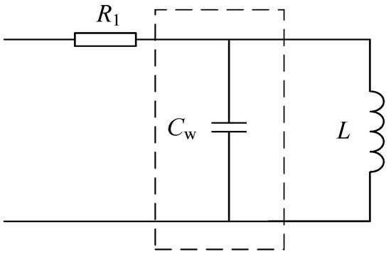 Figure 8c shows waveforms of the voltage and current when series arc faults occur in a circuit when the load is from a motor. A pulse current may occur when series arc faults occur, the main reason for which is that parasitic capacitance Cw appears in the inductor, as shown in Figure 9. Differing from a point close to a purely inductive load, when i crosses zero, the arc will be extinguished, and Rh will rapidly increase. Although the arc gap voltage is equal to u at this point, u is not near the peak. If u is less than Uz, it will not break the arc gap, and the arc will be extinguished. When u is increased, the arc gap will be broken. Most of i will charge Cw at that moment. If the capacity of Cw is sufficiently large, a pulse current will occur; otherwise, a pulse current will not occur. This is because, if the capacity of Cw is extremely small, the voltage of Cw will quickly increase to the power supply voltage, whereas the increase in pulse current will be smaller.