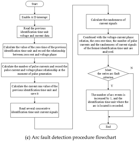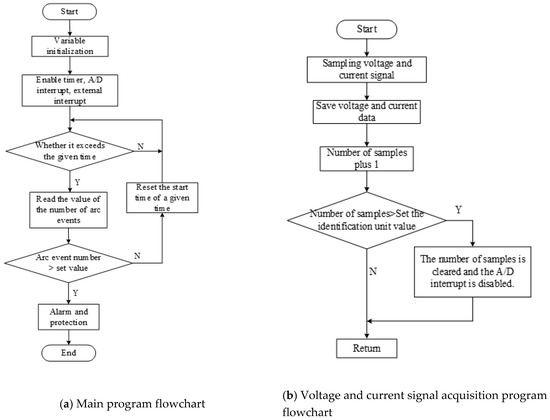 Figure 11a–c shows flowcharts of the main program, the voltage and current signal acquisition program, and the arc fault detection program, respectively. The main program mainly judges whether the number of arc events in a given time meets the conditions to start the corresponding alarm and protection programs. When the number of arc events exceeds the set number of arc events requiring an alarm during a given period of time, it can be judged that series arc faults have occurred in the line, which can prevent a series arc from being judged as a fault arc when plugging into and pulling out of the socket. The voltage and current signal acquisition program is realized using the Analog-to-Digital (A/D) interrupt service program, which samples and saves the voltage and current signal regularly. The arc fault detection program is also implemented using an interrupt service routine. The zero-crossing point of the AC input voltage is used as the triggering of the external interrupt source, that is, every half cycle is used as an arc fault identification time unit. When series arc faults are detected in an identified unit of time, the program judges that the identified unit of time is a fault unit, and a value of 1 is added to the number of arc events.