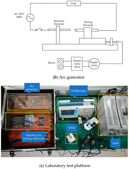 A series arc fault test platform was designed and built with reference to the Chinese national standard GB/T 31143-2014. Figure 13a shows the series arc fault test circuit. Figure 13b shows the arc generator. Figure 13c shows the laboratory test platform. The arc generator consists of a stationary electrode and a moving electrode; one electrode is a carbon-graphite rod and the other electrode is a copper rod. We adjust the distance between the two electrodes by controlling a stepper motor, which will produce a continuous arc when the two electrodes are separated by a certain distance. The digital oscilloscope model used is a Tektronix DPO3054. A TCP0030 current probe is used for current signal acquisition, and a P5200A/50 MHz high-voltage differential probe is used to collect the voltage signals.