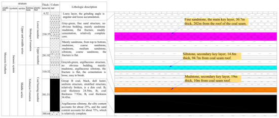 The main coal-bearing stratums in the East Junggar coalfield are the Lower Jurassic Badaowan Formation (J1b) and the Middle Jurassic Xishanyao Formation (J2x). The thickness of single coal seam is 96.44 m at maximum, with an average of 43 m. The Xishanyao Group B formation is a major coal-bearing group in the East Junggar Coalfield, with an average thickness of 70 m and an dipping angle of 5~6°, and contains thin layers of mudstone. The Dajingnan Nº. 1 coal mine is located at the junction of the Jiangjunmiao mining area and the Dajing mining area. It is a typical ultra-thick coal seam mine with an average overburden thickness of 310 m, and the main lithology includes siltstone, fine sandstone, and mudstone. The stratigraphy information is shown in Figure 2.