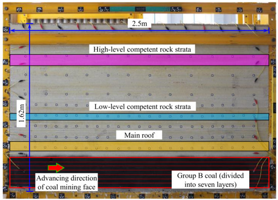 The physical model is constructed based on the conditions of the group B coal at the Dajingnan Nº. 1 coal mine (B1, B3 and B5, with total thickness 67.5 m). The overall model setup is shown in Figure 3. It has dimensions of 2.5 m (length) by 0.2 m (width) by 1.62 m (height), with the geometric ratio of 1:240 (model to in situ). There are 92.5 m boundary pillars at both ends of the model to minimize the boundary effects. The length of the simulated coal seam is 415 m and the overburden thickness is 310 m. The overburden lithology is dominated by fine sandstone and mudstone. The uniaxial compressive strength of fine sandstone is 17.46 MPa, the cohesive is 1.81 MPa, and the uniaxial compressive strength of mudstone is 14.21 MPa, and the cohesive force is 1.41 MPa.