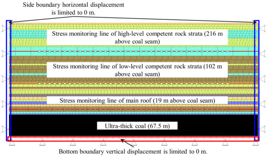 The 2D Discrete Element Modeling (DEM) code Universal Distinct Element Code (UDEC, Itasca Consulting Group, Inc., Minneapolis, Minnesota, USA) is used for the numerical modelling analysis to analyze the characteristics of overburden activities and stress changes in the mining process, due to its capability in representing the behavior of discrete rock mass in the overburden strata. The model size is 800 m by 382 m, with coal seam thickness being 67.5 m. The boundary conditions are shown in Figure 4, where the side and bottom boundary displacement are constrained, and the upper boundary is representing the free surface. Mechanical parameters of coal and rock are shown in Table 1. There are 100 m wide barrier pillar left to minimize the boundary effects. Stress monitoring line is placed in the competent strata layers at 19 m, 102 m and 216 m above the seam, with 61 monitoring points on each line at an interval of 10m. A total of 600 m of each multi-layer is extracted, and after each excavation is completed, the corresponding data is exported for processing. The model is calibrated according to the surface subsidence range and maximum subsidence value after the first layer mining
