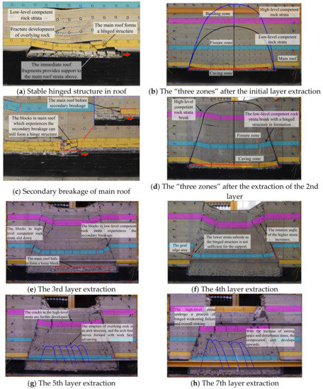 The process of fracture development within the overlying strata in ultra-thick coal seam mining is shown in Figure 5. In the first layer extraction process, the immediate roof fragments provides support to the main roof strata above, and the main roof forms a hinged structure, which limits the movement space of the overlying rock formation further up to a certain extent (as shown in Figure 5a); The distribution of overlying rock “three zone” (caving zone, fissure zone and bending zone) is shown in Figure 5b. During the second layer mining process, the blocks in main roof rotates back to the goaf and the secondary breakage occurs, where the broken rock can still form a hinge structure (as shown in Figure 5c). The low-level competent rock strata break with a hinged structure in formation, and the fractured network propagates upwards to the surface (as shown in Figure 5d). In the third layer mining process, the main roof which experiences the secondary breakage fragments further and the articulation weakens and fails to form loose blocks. The rotation angle of the lower strata increases thus the secondary fracture occurs. The main roof in higher position slid down (as shown in Figure 5e). During the fourth layer mining process, the main roof collapses during the mining process. The lower strata subside as the hinged structure is not sufficient for the support, in the goaf edge area; similarly, the rotation angle of the higher strata increases (as shown in Figure 5f). During the extraction of the fifth layer and the remaining seam, the cracks in the low-level strata are further developed, and the high-level strata undergo a process of hinged weakening failure and overall sinking (Figure 5g,h). In summary, in the process of ultra-thick coal seam mining, the fracture characteristics of the competent rock strata have an obvious pattern of “first breakage with hinged beam structure—second breakage with hinge weakening—multiple disturbance leading to structural instability”.