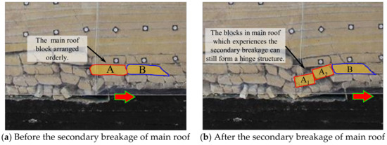 The experiment results indicate that during the multi-layer mining of ultra-thick coal seam, the competent rock mass strata breaks twice under the effect of large-scale mining volume and repeated disturbances. The secondary fracture process of the main roof during the second layer mining is shown in Figure 6. The main roof block A is in close contact with the blocks on both sides when the longwall is retreated underneath, as shown in Figure 6a. When the longwall face is advanced away from block A, it gradually rotates towards the goaf and breaks into sub-blocks A1 and A2, which still form a hinged structure with rock block B, as shown in Figure 6b. As the longwall retreat further ahead, blocks A1 and A2 consolidates in the goaf.