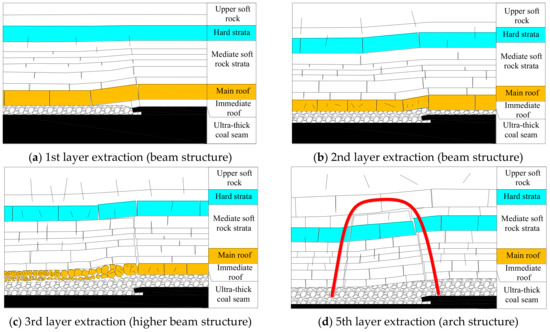 The physical modelling shows that in the process of multi-layer mining of ultra-thick coal seam, the overburden strata evolved from a voussoir beam structure to an arched structure, and the evolution process is shown in Figure 7.