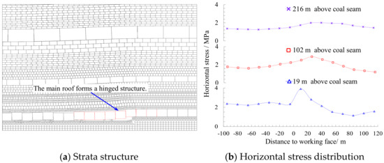 According to the results of numerical simulation, during the early mining stage (the first layer extraction) of the ultra-thick coal seam, the rock blocks in the main roof are subjected to the overburden loading, and the horizontal stress redistribution characteristics are the same as other thick coal seams (Figure 8). There is a horizontal stress concentration in the main roof 10 m in front of the longwall face, with peak value is 3.91 MPa, which is 170% of the in site horizontal stress (2.3 MPa). As the height of the roof increases, the horizontal stress value and the magnitude of change gradually decrease.