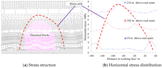 The overlying strata structure and horizontal stress curve at the later mining stage (the fifth layer extraction) is shown in Figure 9. At this time, the overlying strata in the overburden are changed from a beam structure to an arch structure, and the weight of the overlying strata is transferred to the arch feet, forming stress arches in the overburden. The rock mass in the arch is in forms of detached blocks, and the horizontal stress is reduced to 1.2–1.5 MPa, which is 52.17%–65.22% of the initial horizontal stress. The rock mass at the foot of the arch extrude to each other, inducing more horizontal stress with the peak value of 4.8 MPa, which is 2.09 times of the initial horizontal stress. Similarly, with the increase of the height of the roof strata, the arch width gradually decreases.