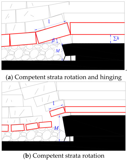 where β is the rotation angle of the detached block; ∑M is the total thickness of coal seam [m]; ∑h1 is the height of the collapse zone below the competent [m]; Kp′ is the residual expansion coefficient; ∑h2 is the height of the fracture zone below the hard rock [m]; Kp″ is the expansion coefficient of the fracture zone.
