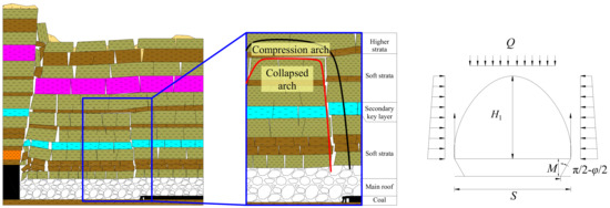 where h is the thickness of the rock strata [m]; l is the length of the rock strata [m]; φ is the friction angle of the contacts [°]. The length l of the broken rock mass in the first stratified mining and the rest of layer mining can be calculated according to Equations (4) and (5), respectively, where l1 is weighting distance of the competent roof in the first stratified mining [m]; q1 is stress acting on the strata [MPa]; Rt is the tensile strength of the rock [MPa]; l2 is the length of the block fracture [m]; q2 is stress acting on the rock block [MPa], depends on the hinging effect of the higher strata.
