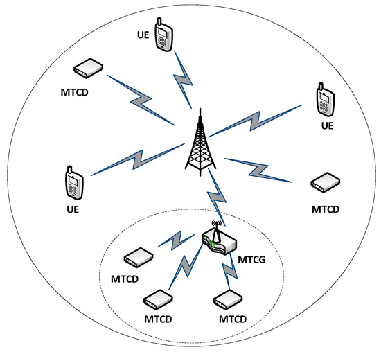 A single cell is considered with diverse distribution of MTC and HTC devices with differing service requirements coexisting. A base station (BS) is at the center of this cell environment with a massive number of MTC users randomly distributed over the entire cell area as depicted in Figure 1. Consider a total of N users being present in the BS coverage with J conventional HTC and K MTC devices. uRLLC service nodes are provided a direct connectivity to the BS in order to ensure low latency and reliable communication link. Direct access to BS by mMTC devices may cause a serious congestion problem due to massive concurrent access event by all devices. A clustered approach is considered for mMTC devices which are grouped and relayed to counteract any congestion at the BS. An MTC gateway (MTCG) is responsible for relaying data of connected MTCDs to the BS for a seamless access experience. An MTCG can either be an MTC device itself or an HTC device relaying for the connected mMTC devices. Because of privacy and data integrity concerns, an mMTC device is selected as the gateway node such that battery lifetime and energy consumption are improved. A decode-and-forward (DF) protocol [35] is used to relay MTCDs traffic for the proposed cellular environment. The selection of a combined access protocol based on a typical LTE-A time-frequency resource division is considered to provide access to HTC and MTC users. Consider an mth mMTC device with bm data bits to be transmitted using a time period -Ti. An MTCG has a minimum rate requirement of bh bits and the transmission times allocated to MTCD and MTCG are denoted, respectively, as tm and th. This involves a two-stage operation in the uplink frame through which each MTCD communicates with the BS via MTCG. The uplink resource is allocated directly to the MTC and HTC devices to comply with the reliability condition and ensure minimum delay.
