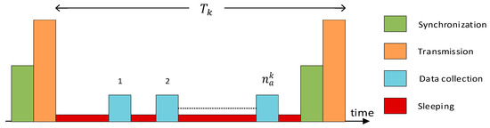 The optimization of expected battery lifetimes of MTC devices is an important consideration to enhance device performance and ensure a longer period of operation in the absence of recharging opportunity. Accurate modeling of the battery consumption pattern of MTCDs becomes critical considering the variance of energy consumption levels during the duty cycle of a typical MTC node as shown in Figure 2. The energy consumption per device is considered as a semi-regenerative process with regeneration occurring at the end of each interval of successful data transmission. The remaining battery energy of any kth MTCD at time instant to is denoted as Ek(to), and the transmission interval period and the average packet size being denoted as Tk and Dk respectively. Power consumption for sleeping and transmission modes is denoted as and ( + ) respectively, where is the consumed power by the electronic components during data transmission and is the required transmit power necessary for reliable data transmission. The expected battery lifetime of MTC devices for each transmission interval Tk for any node k is defined as the direct product of ratio between remaining energy to average energy consumption and the data transmission interval period described as: